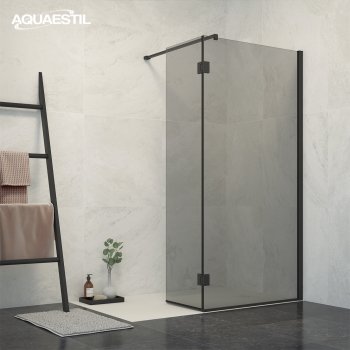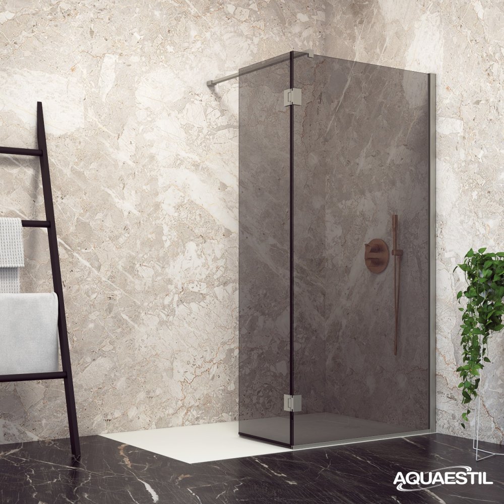 Eine Duschwand, der aus einer festen Glaswand und einem um 180° drehbaren Drehteil mit drei Stopppunkten.