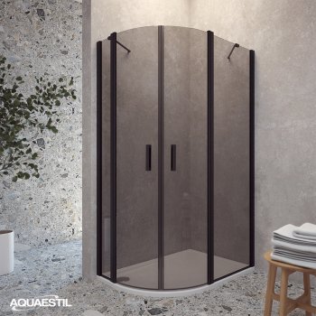 A modern semicircular shower enclosure consisting of two "D" panels with doors. Each panel consists of a hinged door and a fixed section. The enclosure features elegant profiles available in silver, black matte, or white matte finishes and 6 mm tempered glass with a factory-applied anti-scale nano-coating. Magnetic seals and a lift door system ensure excellent functionality and splash protection.