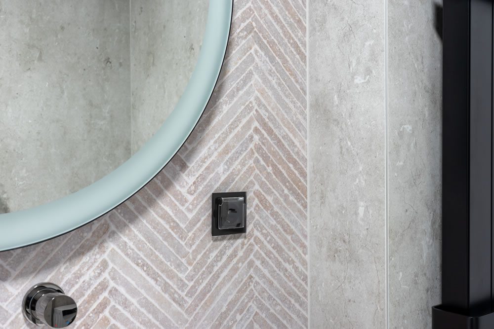 Za razliku od klasičnog opremanja kupaonice, ovdje  je posebnost u tome što su umjesto keramičkih pločica na zidove i podove postavljeni zidni paneli. Paneli su fleksibilni pa je obrada laka bez straha od pucanja. Investitori su se najprije dvoumili, no osim tehničkih karakteristika ovih ploča, privuklo ih je to što su paneli veliki i imaju minimalno fuga te su modernog dizajna. Uspjeli su pronaći kombinaciju dekora koja je odgovarala njihovim željenim bojama i uklapala se uz ostatak uređenja.