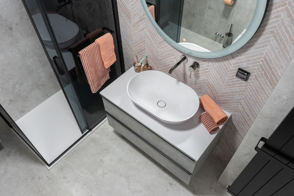 Od četiri moderna umivaonika koji se mogu smjestiti na baze iz linije Grande TOP, investitori su odabrali nadgradni bijeli umivaonik ovalnog oblika iz linije TITAN Long round. Ploča baze također je u bijeloj boji, a izrađena je od lijevanog mramora, materijala koji se odlikuje iznimnom čvrstoćom, otporan je na habanje, postojan na vodu i vlagu te slovi kao dugovječan. Ormarić ispod umivaonika izrađen je od iverala koji se kantira naprednom tehnologijom (ABS traka) zbog čega nema opasnosti od ulaska vlage. Ladice imaju dekor betona i crne ručke koje su istodobno neupadljive, ali i zgodan detalj koji zaokružuje čitav dizajn ormarića.