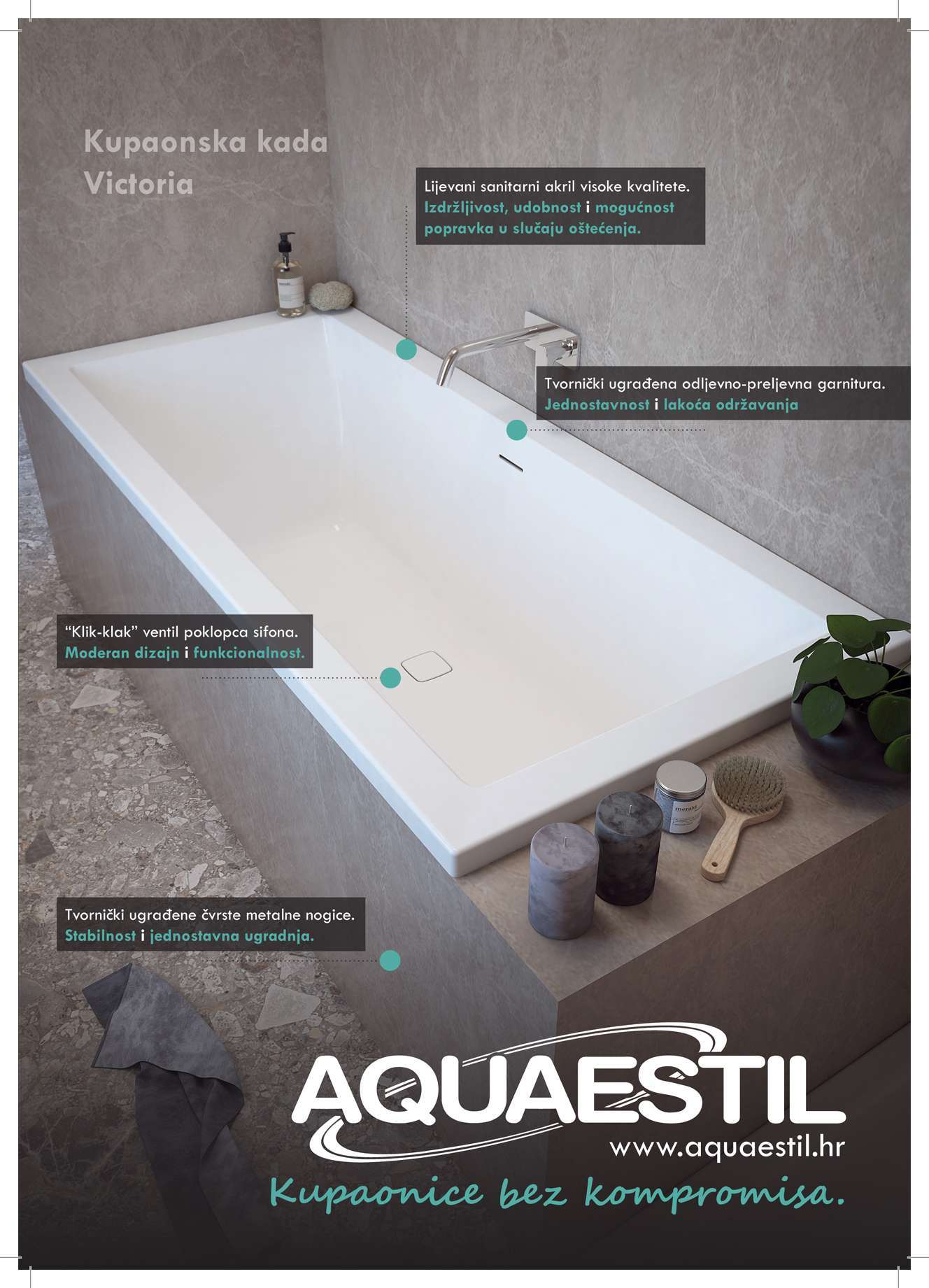 Prodajna mrežaSvakodnevno čišćenje i održavanje kupaonskih kada Aquaestil od lijevanog sanitarnog akrila brzo je i jednostavno. Za čišćenje koristite krpu ili glatku spužvu i bilo koji standardni tekući kupaonski deterdžent. Izbjegavajte abrazivna sredstva za čišćenje i sredstva za čišćenje koja sadrže mikrogranule koje bi mogle strugati površinu. Za uklanjanje kamenca preporuča se glatka spužva namočena u ocat ili sredstvo na bazi octa. Nakon čišćenja, površinu je potrebno isprati vodom i osušiti. Sredstva sa sljedećim sastojcima izričito se ne smiju koristiti na akrilnim proizvodima: vodikov peroksid, amonijak, aminofenol, fenilendiamin, toluendiamin, resorcinol, jod.