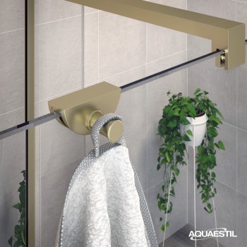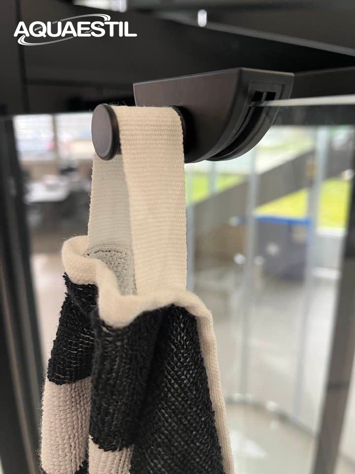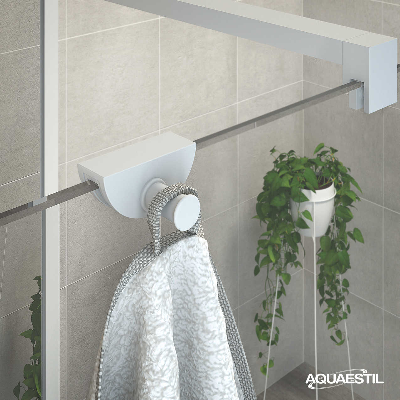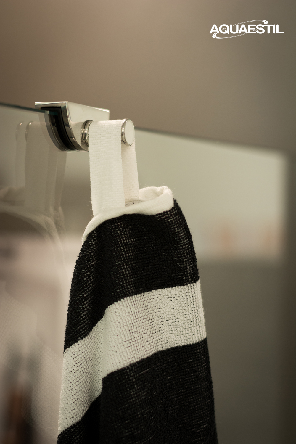 Držač za ručnike širine 41,5 cm izrađen je od nehrđajućeg čelika i izvrstan je dodatak Aquaestil paravanima. Držač za ručnike moguće je ugraditi na fiksnu stijenu bilo kojeg paravana iz Aquaestil programa. Držač za ručnike naručuje se prilikom narudžbe paravana uz obaveznu skicu s željenom pozicijom držača. Naknadna ugradnja držača za ručnike na već isporučeni i/ili montirani paravan nije moguća. Držač je dostupan u srebrnoj, crnoj mat i bijeloj mat boji.