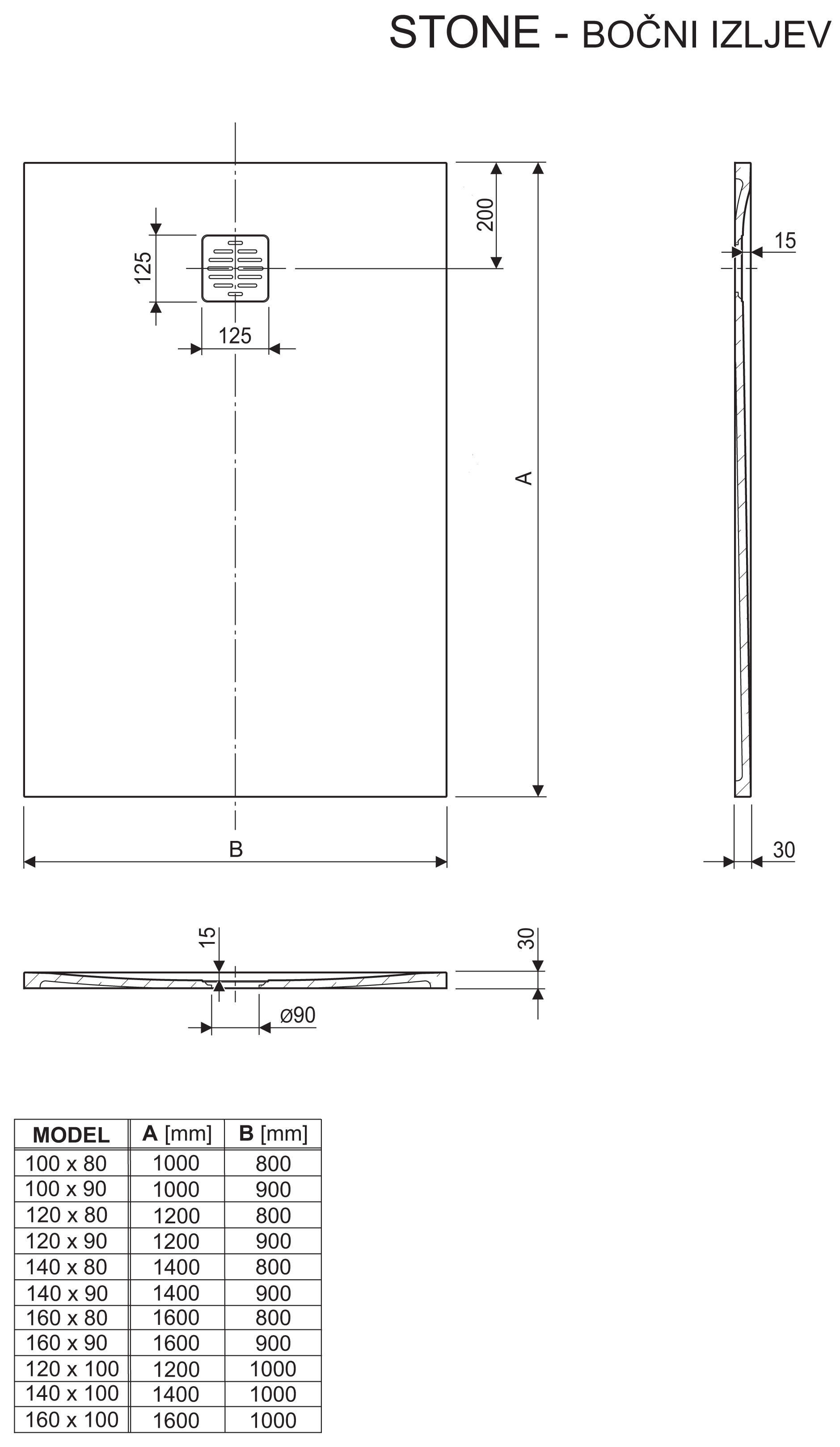 • Poziciju sifona za svaku od dimenzija pravokutnih tuš kada Stone provjerite na nacrtima u poglavlju "tehničke informacije".