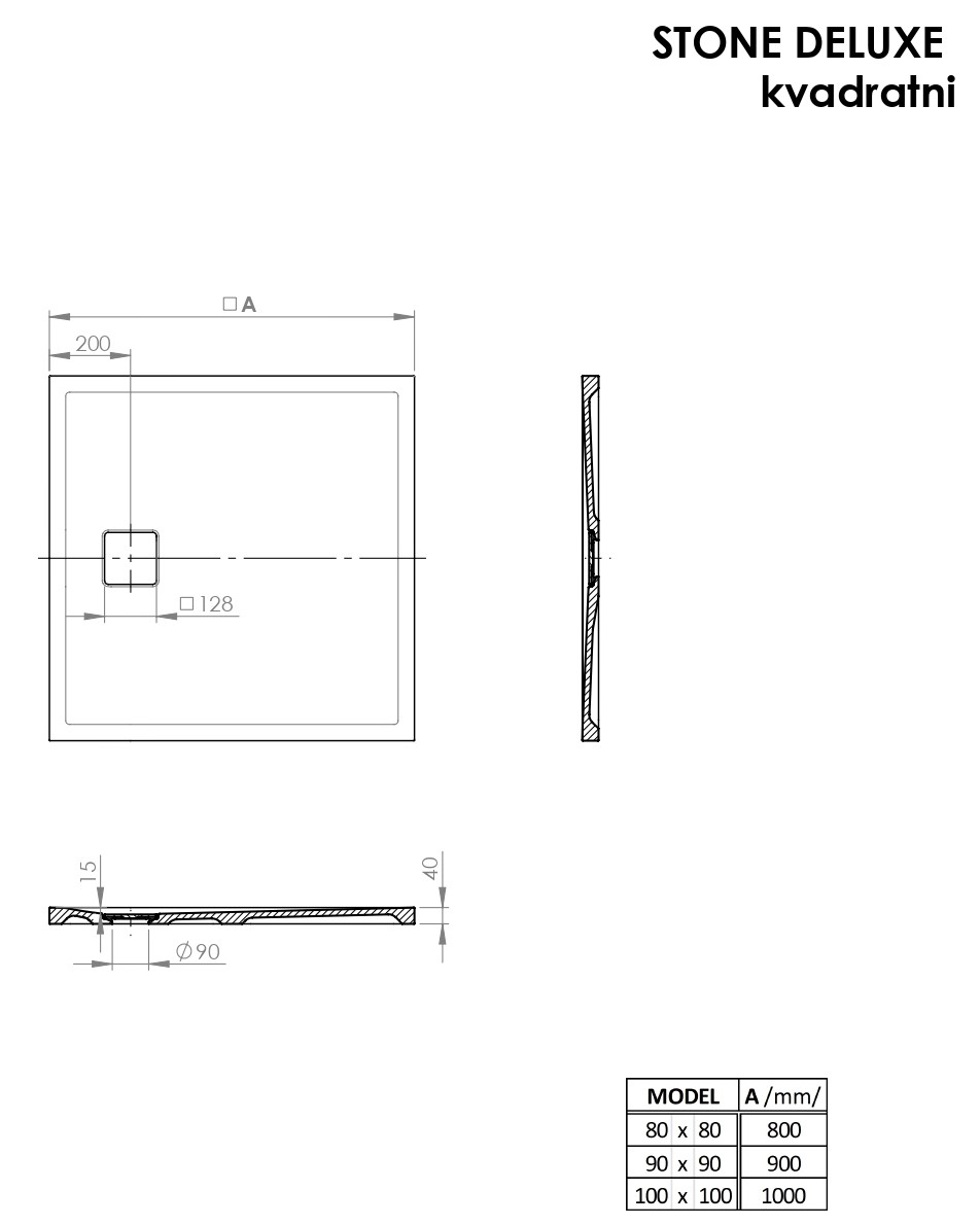 Tuš kade Stone DeLuxe od lijevanog mramora nude čvrstu i sofisticiranu površinu koja imitira beton u bijeloj, bež, crnoj ili cement sivoj boji. Atraktivan poklopac sifona izveden u identičnom efektu kao i površina tuš kade pridonosi karakterističnom izgledu Stone DeLuxe tuš kada. Posebna prednost tuš kada Stone DeLuxe je mogućnost rezanja do određenih gabarita radi prilagodbe specifičnoj konfiguraciji prostora za tuširanje.