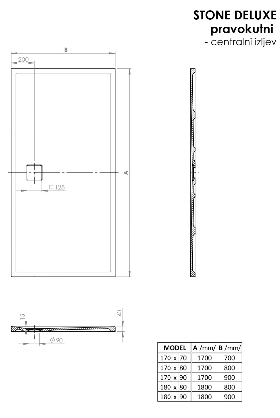 Tuš kade Stone DeLuxe od lijevanog mramora nude čvrstu i sofisticiranu površinu koja imitira beton u bijeloj, bež, crnoj ili cement sivoj boji. Atraktivan poklopac sifona izveden u identičnom efektu kao i površina tuš kade pridonosi karakterističnom izgledu Stone DeLuxe tuš kada. Posebna prednost tuš kada Stone DeLuxe je mogućnost rezanja do određenih gabarita radi prilagodbe specifičnoj konfiguraciji prostora za tuširanje.
