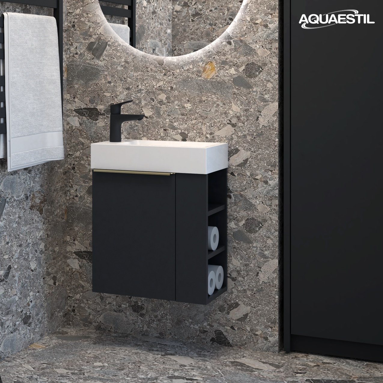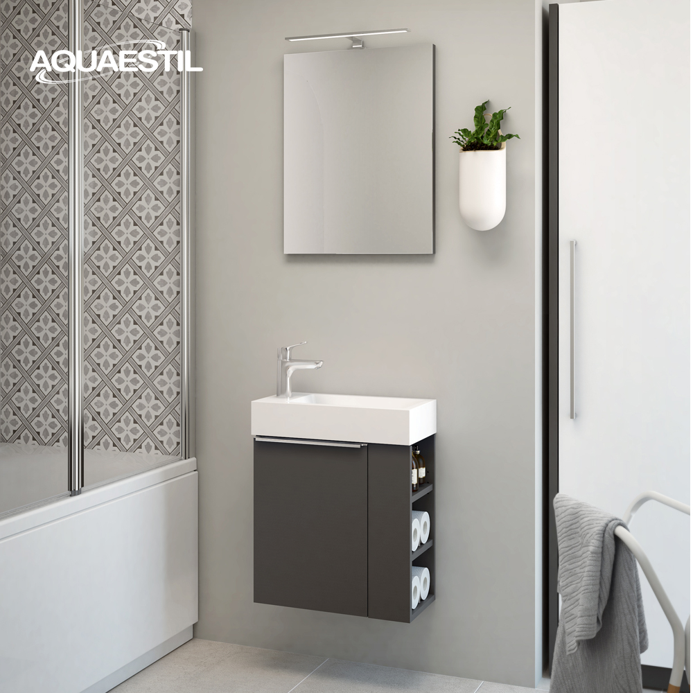 Il materiale dei mobili da bagno Aquaestil è resistente all'umidità, ma non completamente impermeabile. L'esposizione prolungata a livelli elevati di umidità e acqua può causare il rigonfiamento dei bordi delle parti in legno dei mobili e la possibile corrosione degli specchi.
