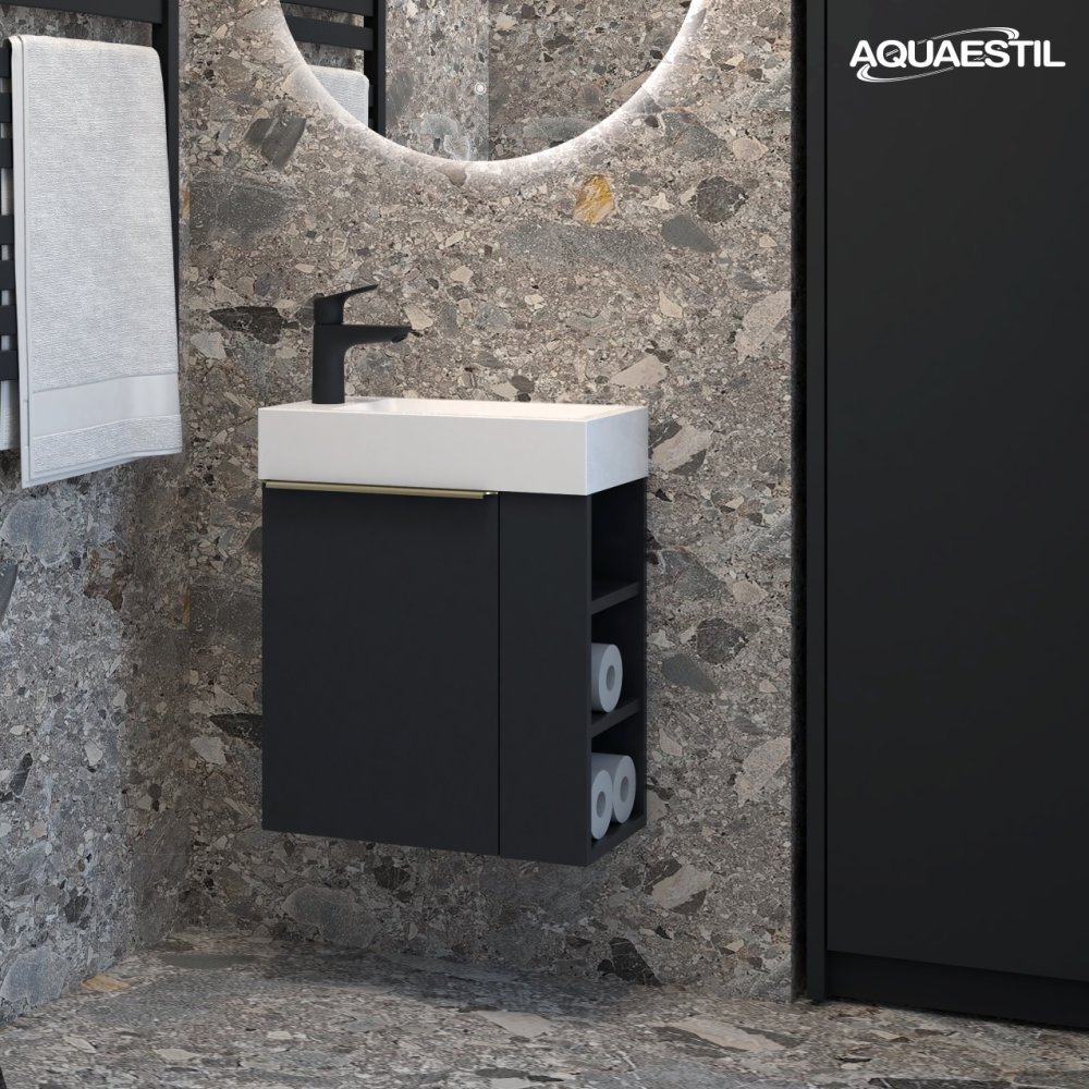 I lavabi dei mobili da bagno Aquaestil sono realizzati in ghisa minerale o, in alcune linee, in ceramica. Per la pulizia e la manutenzione dei lavabi Aquaestil, è possibile utilizzare la Aquaestil agente per la pulizia delle superfici in acrilico e vetro o un detergente liquido standard per il bagno. Per rimuovere il calcare, si consiglia di utilizzare aceto o prodotti specifici per la rimozione del calcare che non contengono microgranuli, in grado di graffiare la superficie del lavabo.