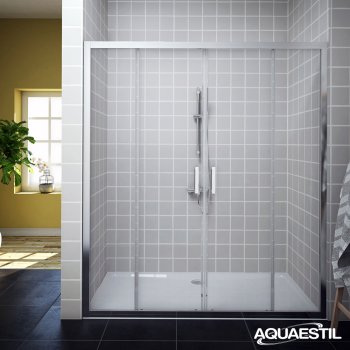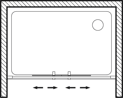 Questo box doccia moderno si compone di due porte scorrevoli e due ante fisse, sviluppate per piatti doccia di grandi dimensioni installati fra tre muri. Per questo modello è possibile aggiungere un profilo d'estensione di 3 cm.